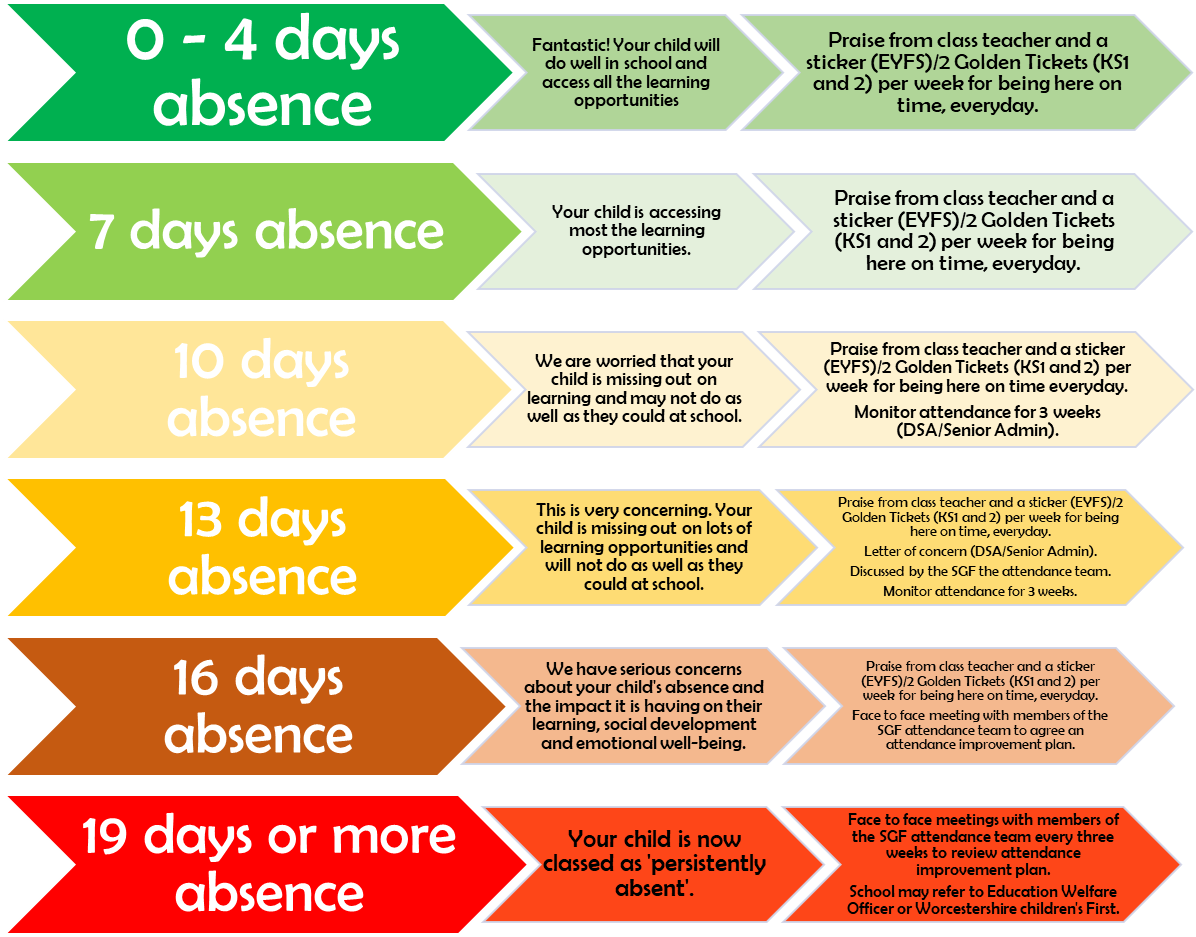 If your child is absent, you must contact the school office on the day. You can do this by phoning 01527 62263 or emailing: office@sgf.endeavourschools.org
