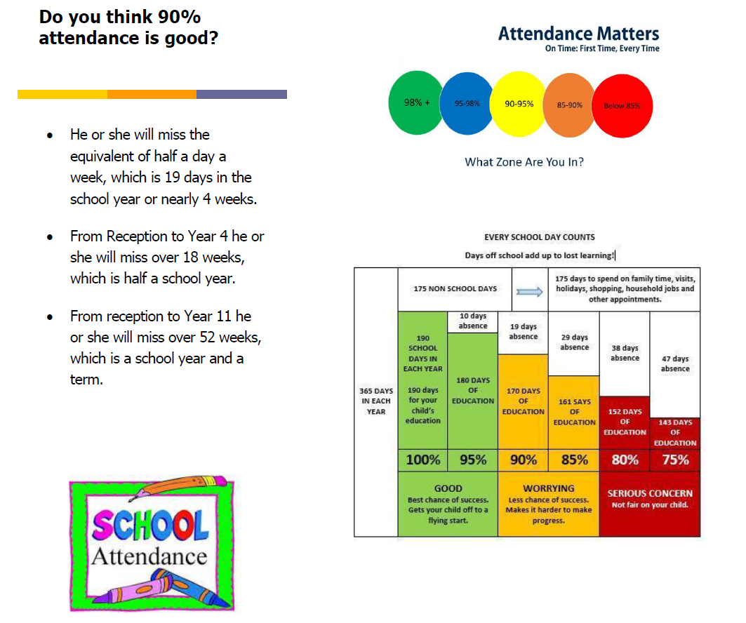 Good attendance helps your child to build firm and positive friendships with other children and good relationships with their teachers.  Regular attendance at school helps them to learn and make good progress, as their learning journey is continuous and follows a logical sequence.  Good attendance from Nursery upwards builds good habits that will pay dividends as they move through our school and onto middle school, high school and beyond.
