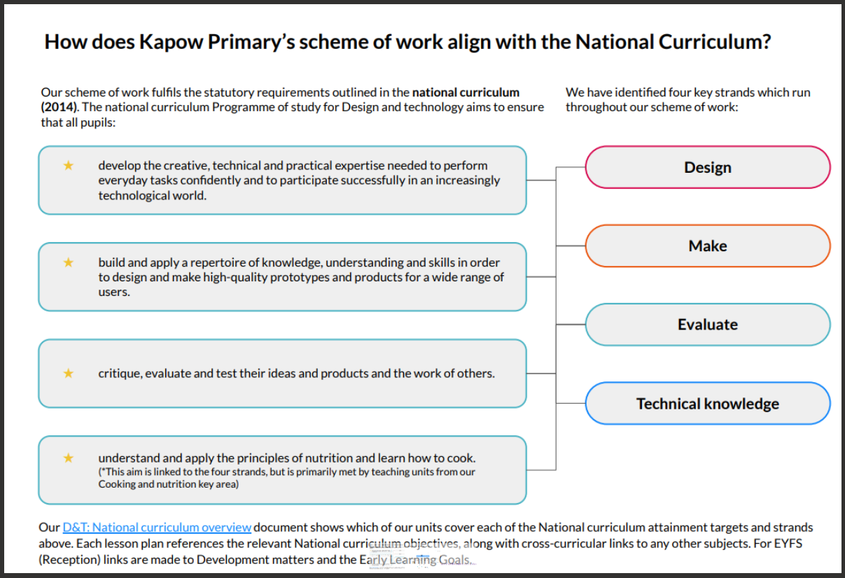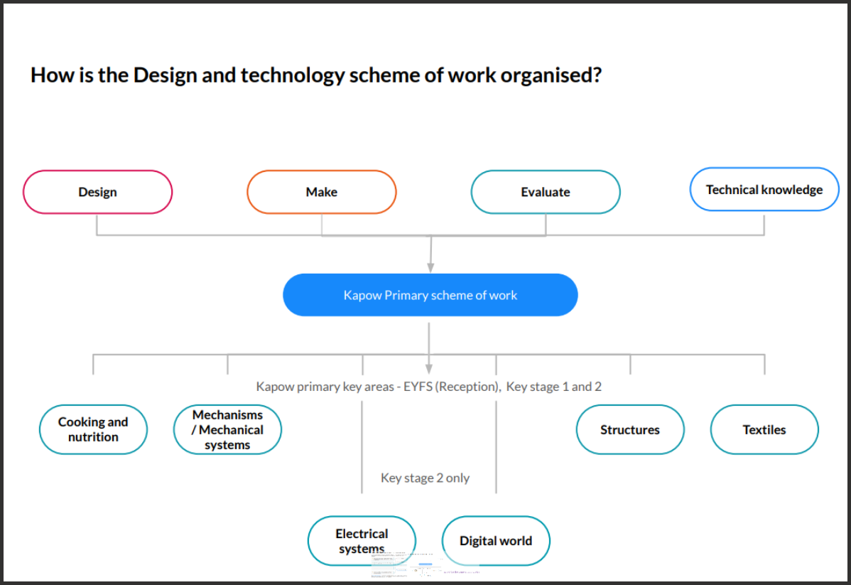The Kapow Primary DT scheme provides a comprehensive and flexible framework that supports schools in delivering a broad and balanced curriculum. It is designed around six key areas: Structures, Mechanisms, Textiles, Electrical Systems, the Digital World, and Cooking and Nutrition. These areas are explored through four key strands: Design, Make, Evaluate, and Technical Knowledge.