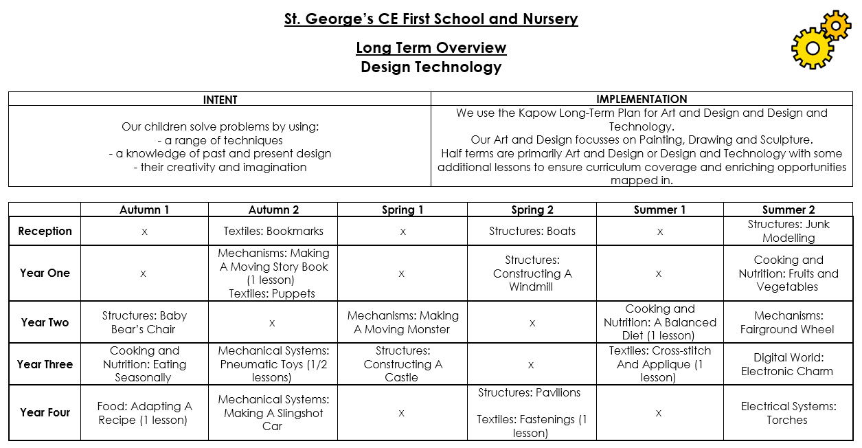 At St George’s, our vision is grounded in Psalm 139:14, reminding us that each child is "fearfully and wonderfully made," with unique talents and aspirations. We strive to nurture these gifts through a well-rounded curriculum, empowering our pupils to shape the world around them. Our approach to Design and Technology (DT) reflects this vision, encouraging creativity, problem-solving, and practical skills that inspire our children to contribute positively to their communities and beyond.